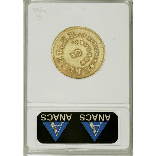 <B>(1837-42) $5 C. Bechtler Five Dollar, RUTHERF:--Repaired, Cleaned--ANACS. VF30 Details.</B></I> K-23, High R.6. A rare <I>Guide Book</B></I> variety from late in Christopher Bechtler's private minting career. This thickly hairlined green-gold example is repaired on the reverse border at 1 and 7 o'clock. Listed on page 346 of the 2007 <I>Guide Book.</B></I><BR><BR><b>Shipping:</b> Coins & Currency (<a target="_blank" href="http://www.heritageauctions.com/common/shipping.php">view shipping information</a>)