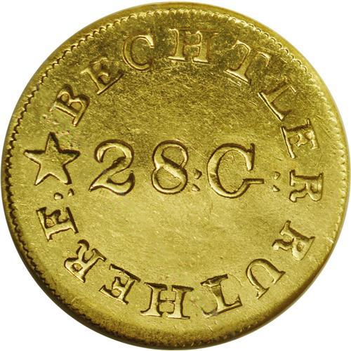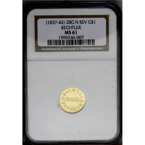 <B>(1837-42)<G$1> C.Bechtler Dollar, N Reversed MS61 NGC.</B></I> K-4, R.4. A Mint State example of this popular Bechtler type. The N in ONE is reversed and sharply repunched, which immediately identifies the variety. The fields are unusually clean, and are slightly sunken beneath 28 G and the E in ONE. Listed on page 345 of the 2006 <I>Guide Book.</B></I> Census: 11 in 61, 6 finer (2/06).