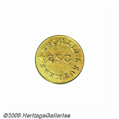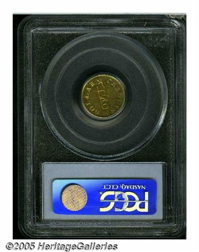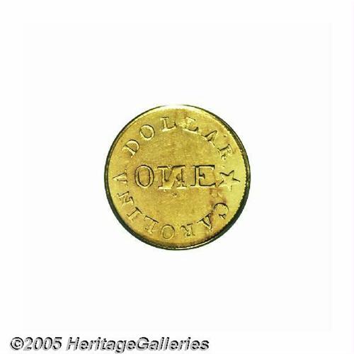 <B>(1837-42)<G$1> C.Bechtler Dollar, N Reversed MS61 PCGS.</B></I> K-4, R.4. The popular variety with the reversed and repunched N in ONE, Kagin-4 is available by the standards of Bechtler private gold coinage. However, the variety is unquestionably elusive in Uncirculated grades. An unmarked and moderately reflective piece with honey and apricot hues. Struck from lightly rusted and widely rotated dies. The die crack through the INA in CAROLINA is present; Kagin states "About 50% with [this] reverse die break." Listed on page 292 of the 2005 <I>Guide Book.</B></I> Population: 2 in 61, 6 finer (6/05).<BR><I>From The Great Western Collection of Territorial Gold.</B></I>