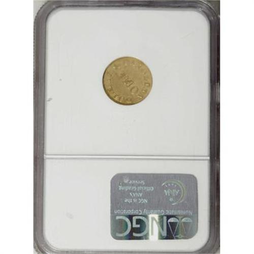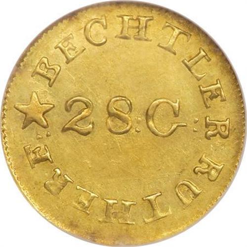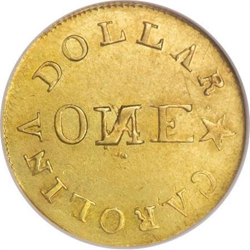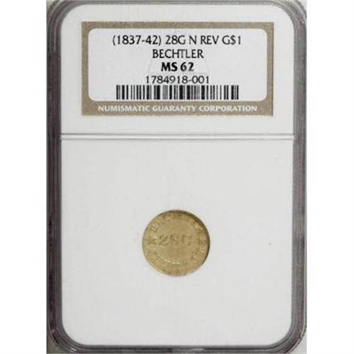 <B>(1837-42) G$1 C. Bechtler Dollar, N Reversed MS62 NGC.</B></I> <B>(1837-42) G$1 C.Bechtler Dollar, N Reversed MS62 NGC.</B></I> K-4, R.4. The repunched and inverted N in ONE identifies this popular Bechtler variety. Hints of honey patina are seen over the satiny olive-gold surfaces. The obverse field has a couple of wispy marks, but this has no substantial impact on the eye appeal of this high grade example. Survivors are usually encountered in XF or AU condition, and this is one of the finest examples known of this popular Bechtler variety. The dies are widely rotated. Listed on page 349 of the 2008 <I>Guide Book.</B></I> Census: 4 in 62, 3 finer (7/07).<BR><BR><b>Shipping:</b> Coins & Currency (<a target="_blank" href="http://www.heritageauctions.com/common/shipping.php">view shipping information</a>)