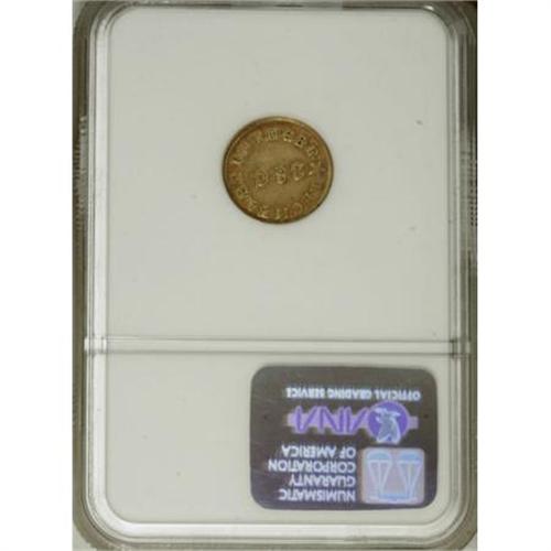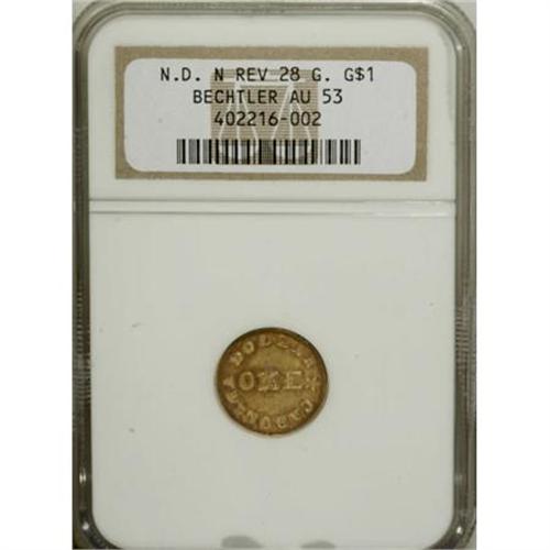 <B>(1837-42) G$1 C. Bechtler Dollar, N Reversed AU53 NGC.</B></I> K-4, R.4. Rich orange and green-gold toning aids the eye appeal of this moderately circulated pioneer gold coin. A few inconspicuous marks near the 8 in 28 G are barely worthy of mention. Listed on page 349 of the 2008 <I>Guide Book</B></I>.<BR><BR><b>Shipping:</b> Coins & Currency (<a target="_blank" href="http://www.heritageauctions.com/common/shipping.php">view shipping information</a>)