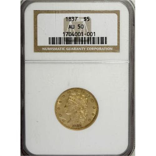 <B>1837 $5 AU50 NGC.</B></I> Large Date, Small 5, Breen-6511, McCloskey 1-A, R.4. Premium appeal for a Classic Head five, with light greenish-gold coloration and considerable luster clinging to each side, combined with a minimum of singular abrasions.<BR><BR><B>Coin Engraver:</B> William Kneass<BR><BR><b>Shipping:</b> Coins & Currency (<a target="_blank" href="http://www.heritageauctions.com/common/shipping.php">view shipping information</a>)