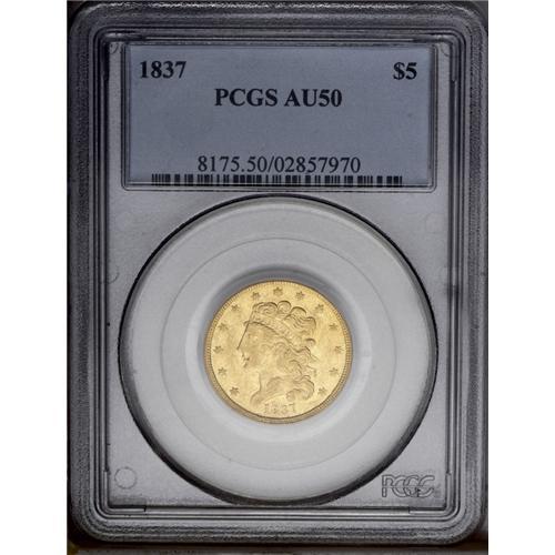 1837 $5 AU50 PCGS. Breen-6512, Large Date, Large 5, Mc