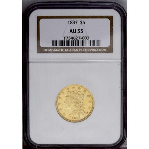 <B>1837<$5> AU55 NGC.</B></I> Breen-6512, Large Date, Large 5, McCloskey 2-B, R.3. Yellow-gold surfaces yield traces of luster, and display well defined design features, though some of the star centers are soft. The few minute contact marks scattered about are not offensive.