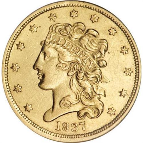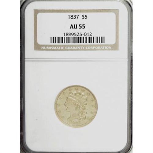 <B>1837 $5 AU55 NGC.</B></I> Large Date, Large 5, Breen-6512, McCloskey 2-B, R.3. This Choice AU coin is remarkably well struck on the central devices, the eagle's head and talons, and the reverse legends. Only a few of the obverse stars show slight incompleteness. This issue is scarcer than expected, considering its high original mintage of 207,121 pieces. <BR><BR><B>Coin Engraver:</B> William Kneass<BR><BR><b>Shipping:</b> Coins & Currency (<a target="_blank" href="http://www.heritageauctions.com/common/shipping.php">view shipping information</a>)