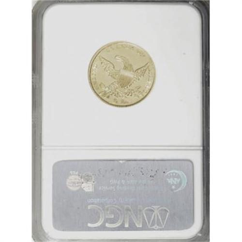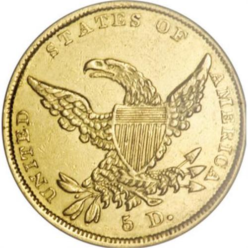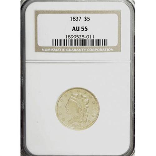 <B>1837 $5 AU55 NGC.</B></I> Large Date, Large 5, Breen-6512, McCloskey 2-B, R.3. Three distinct varieties are known. The McCloskey 2-B die combination has a single forehead curl on the obverse, and a Block 8 date logotype. This piece is fully brilliant with lustrous greenish-gold surfaces.<BR><BR><B>Coin Engraver:</B> William Kneass<BR><BR><b>Shipping:</b> Coins & Currency (<a target="_blank" href="http://www.heritageauctions.com/common/shipping.php">view shipping information</a>)