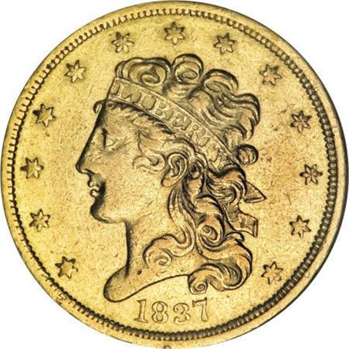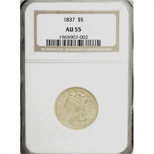 <B>1837 $5 AU55 NGC.</B></I> Large Date, Large 5, Breen-6512, McCloskey 2-B, R.3. Premium appeal is the hallmark of this delightful Choice AU specimen, with enticing, lustrous green-gold fields, light, grade-consistent abrasions, and a strike that is bolder than normal. The reverse is particularly choice for the grade.<BR><BR><B>Coin Engraver:</B> William Kneass<BR><BR><b>Shipping:</b> Coins & Currency (<a target="_blank" href="http://www.heritageauctions.com/common/shipping.php">view shipping information</a>)