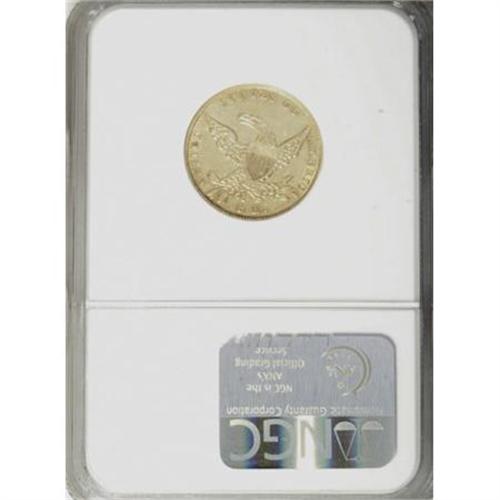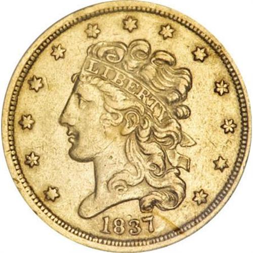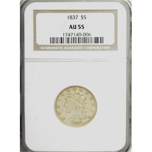 <B>1837 $5 AU55 NGC.</B></I> Large Date, Large 5, Breen-6512, McCloskey 2-B, R.3. Single forehead curl with a block style 8 in the date. Lightly abraded, but lustrous yellow-gold surfaces. The 1837 Classic half eagle is a scarce, underrated date, although generally not recognized as such.<BR><BR><B>Coin Engraver:</B> William Kneass<BR><BR><b>Shipping:</b> Coins & Currency (<a target="_blank" href="http://www.heritageauctions.com/common/shipping.php">view shipping information</a>)