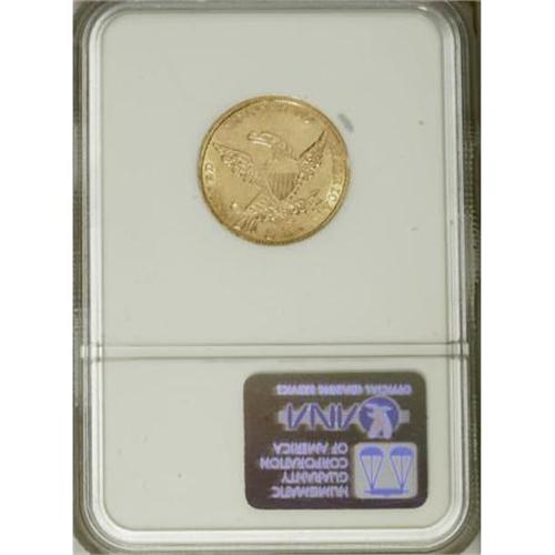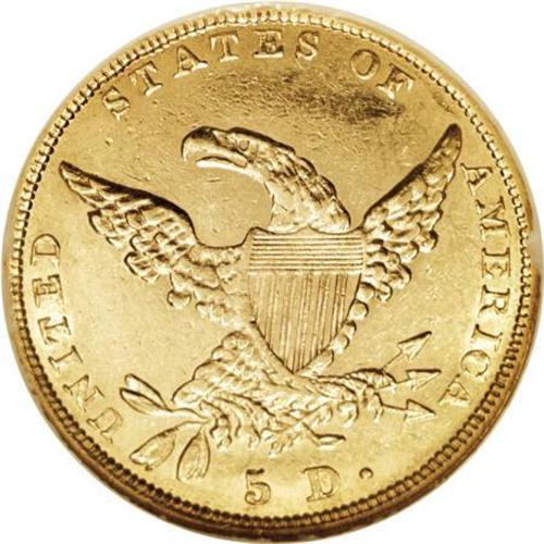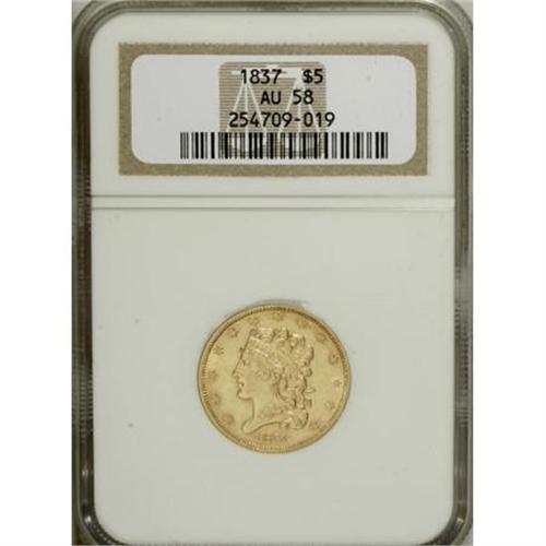 <B>1837 $5 AU58 NGC.</B></I> Small Date, Breen-6513, McCloskey 3-C, R.4. Luster fills the borders and devices of this pleasing Borderline Uncirculated representative. Although it currently commands a meager premium, the 1837 is significantly scarcer than the 1834 through 1836 dates, and provides good value to the knowledgeable gold type collector.<BR><BR><B>Coin Engraver:</B> William Kneass<BR><BR><b>Shipping:</b> Coins & Currency (<a target="_blank" href="http://www.heritageauctions.com/common/shipping.php">view shipping information</a>)