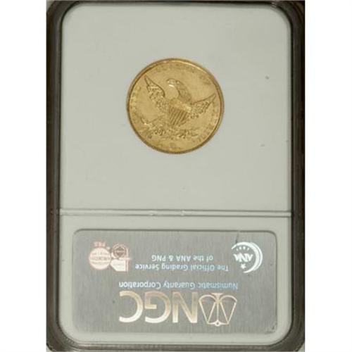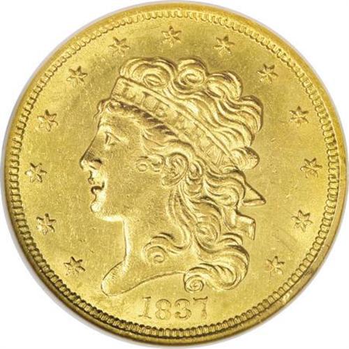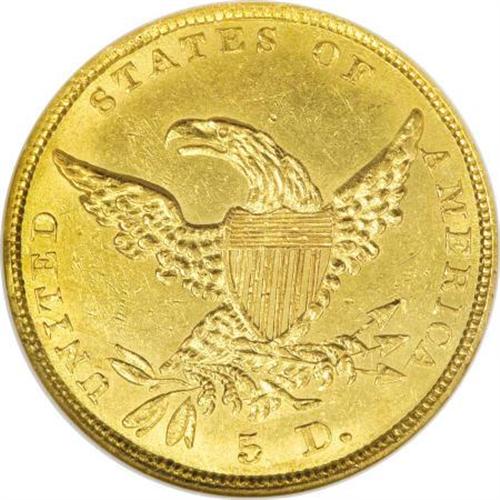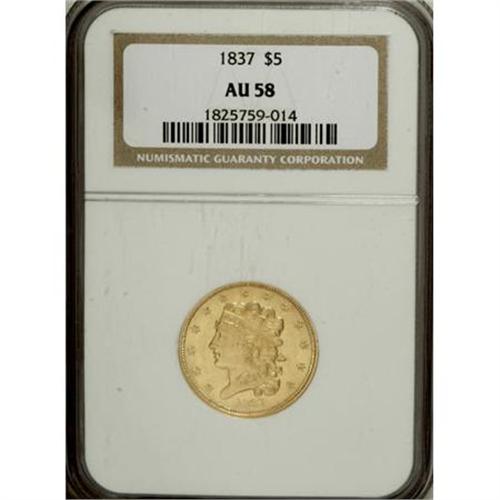 <B>1837 $5 AU58 NGC.</B></I> Large Date, Small 5, Breen-6511, McCloskey 1-A, R.4. This variety is promptly identified by its double forehead curl. The present piece is an impressively unabraded half eagle that has a pleasing strike and extensive remaining luster. A worthy acquisition by the gold type collector.<BR><BR><B>Coin Engraver:</B> William Kneass<BR><BR><b>Shipping:</b> Coins & Currency (<a target="_blank" href="http://www.heritageauctions.com/common/shipping.php">view shipping information</a>)