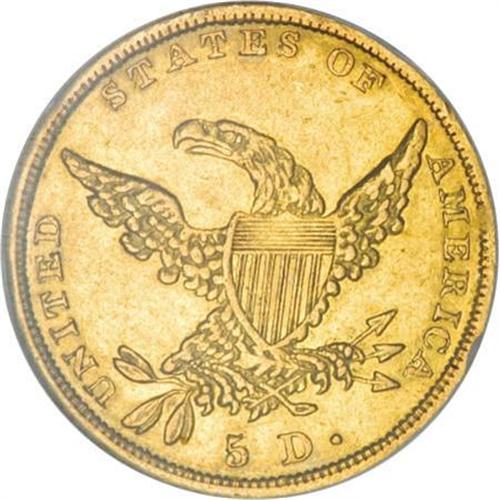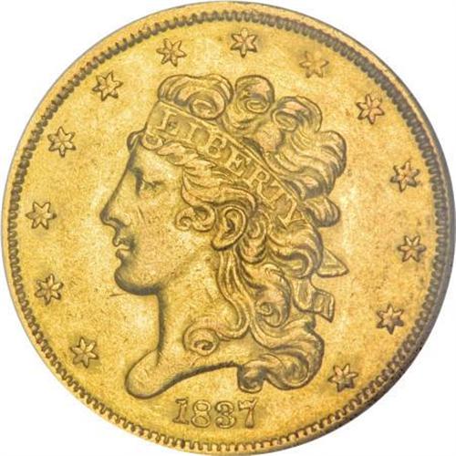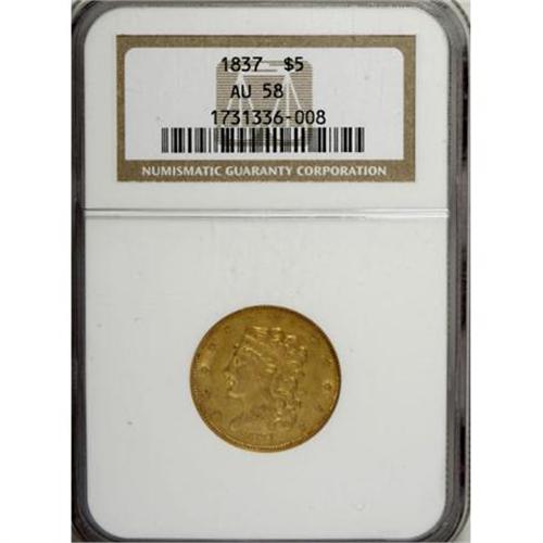 <B>1837 $5 AU58 NGC.</B></I> Small Date, Breen-6513, McCloskey 3-C, R.4. The obverse is identified by a single forehead curl and a fancy or script style 8 in the date. McCloskey 3-C, like variety 1-A, is considered somewhat scarcer than variety 2-B. This one has rich green-gold with traces of deep orange, over highly lustrous surfaces.<BR><BR><B>Coin Engraver:</B> William Kneass<BR><BR><b>Shipping:</b> Coins & Currency (<a target="_blank" href="http://www.heritageauctions.com/common/shipping.php">view shipping information</a>)