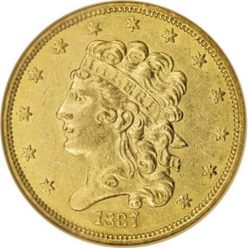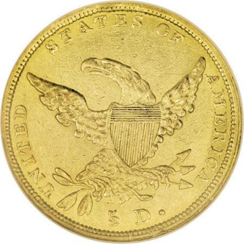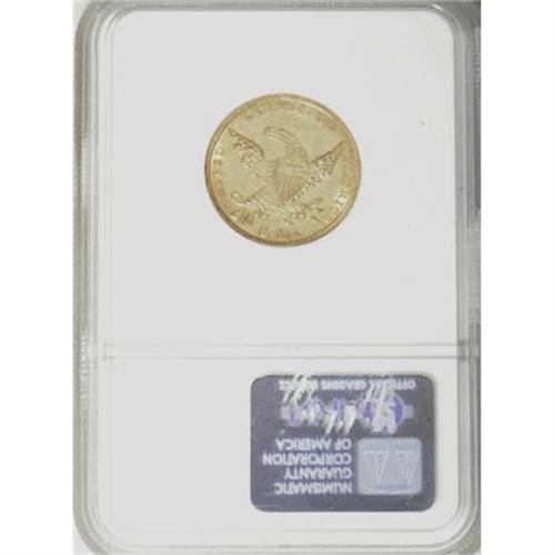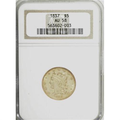 <B>1837 $5 AU58 NGC.</B></I> Small Date, Breen-6513, McCloskey 3-C, R.4. Being a challenging coin to locate in Mint State, this AU58 example offers an acceptable alternative to the budget-minded collector. Nicely detailed and with ample luster in the protected areas. Census: 62 in 58, 51 finer (12/07).<BR><BR><B>Coin Engraver:</B> William Kneass<BR><BR><b>Shipping:</b> Coins & Currency (<a target="_blank" href="http://www.heritageauctions.com/common/shipping.php">view shipping information</a>)
