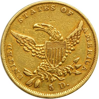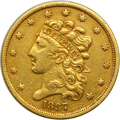 1837 $5. Sharpness of XF40. Cleaned. Golden coloration on both sides.