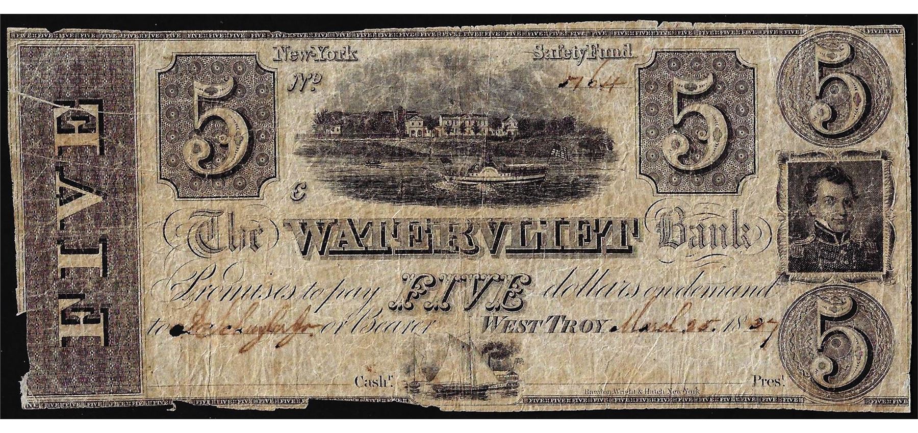 1837 $5 The Watervliet Bank West Troy, NY Obsolete Note