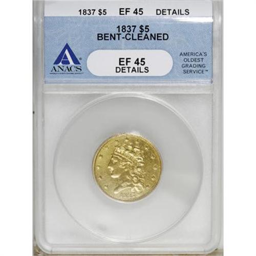 <B>1837 $5 --Bent, Cleaned--ANACS. XF45 Details.</B></I> NGC Census: (48/236). PCGS Population (21/105). Mintage: 207,121. Numismedia Wsl. Price for NGC/PCGS coin in XF45: $1,038. (#8175)<BR><BR><B>Coin Engraver:</B> William Kneass<BR><BR><b>Shipping:</b> Coins & Currency (<a target="_blank" href="http://www.heritageauctions.com/common/shipping.php">view shipping information</a>)