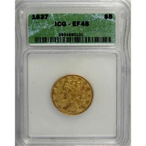 <B>1837 $5 XF45 ICG.</B></I> Large Date, Small 5, Breen-6511, McCloskey 1-A, R.4. Luminous antique-gold surfaces show occasional mustard accents. Well struck overall with an abrasion at the left obverse that passes through star 3.<BR><BR><B>Coin Engraver:</B> William Kneass<BR><BR><b>Shipping:</b> Coins & Currency (<a target="_blank" href="http://www.heritageauctions.com/common/shipping.php">view shipping information</a>)