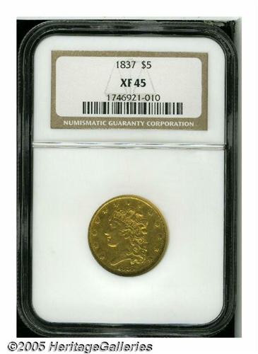 <B>1837<$5> XF45 NGC.</B></I> Large Date, Large 5, Breen-6512, McCloskey 2-B, R.3. A moderately circulated canary-gold example. The surfaces are slightly glossy and exhibit no unpleasant marks.