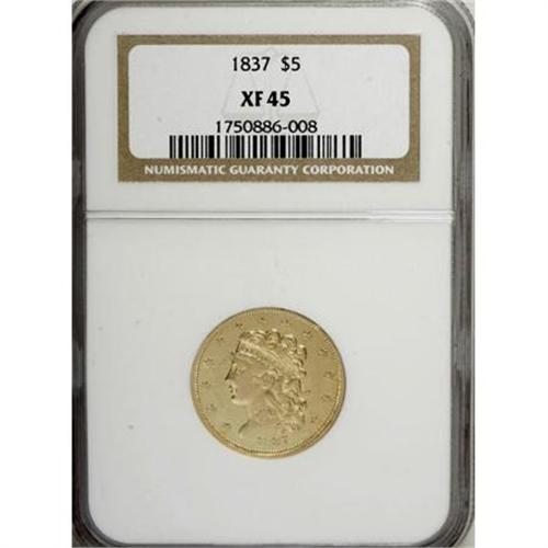 <B>1837 $5 XF45 NGC.</B></I> Large Date, Small 5, Breen-6511, McCloskey 1-A, R.4. A surprisingly radiant lemon-gold piece that shows significant luster despite light wear overall. Well struck overall with light abrasions and a small rim bruise at the upper right obverse.<BR><BR><B>Coin Engraver:</B> William Kneass<BR><BR><b>Shipping:</b> Coins & Currency (<a target="_blank" href="http://www.heritageauctions.com/common/shipping.php">view shipping information</a>)