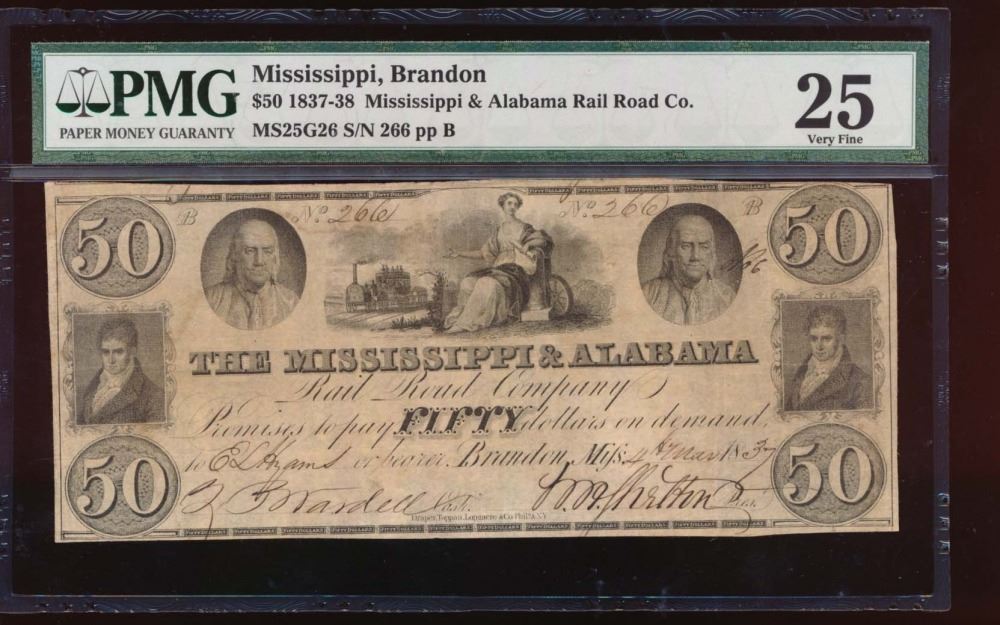 One 1837 $50 Mississippi and Alabama Obsolete Note PMG 25.