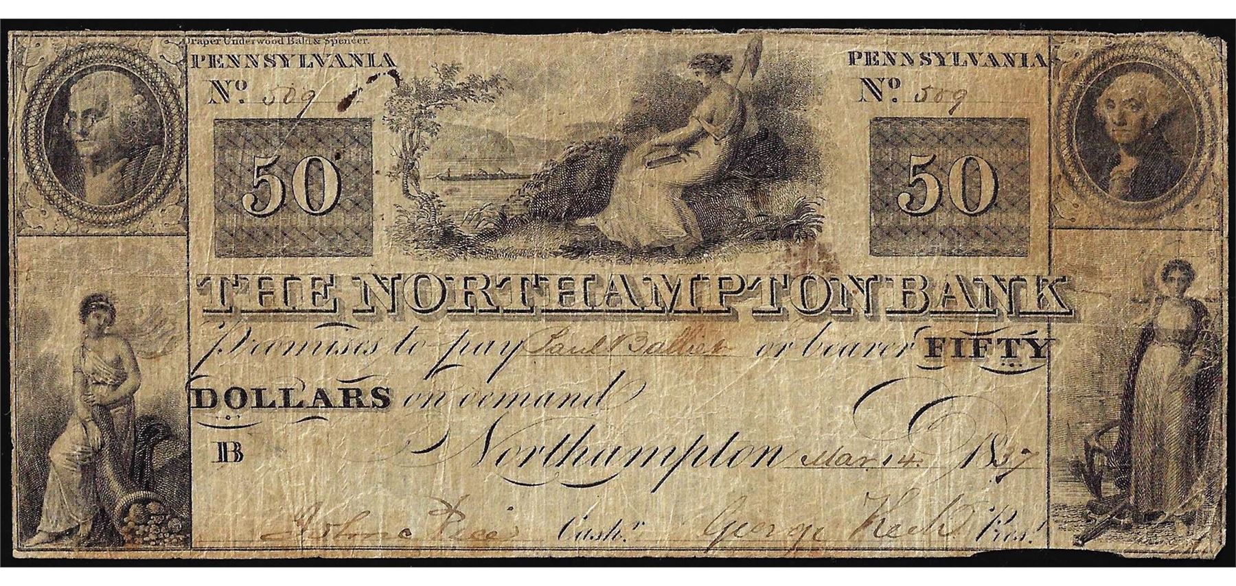 1837 $50 The Northampton Bank Northampton, PA Obsolete Note