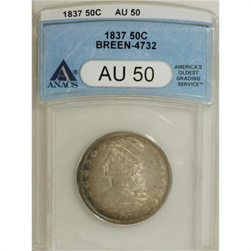 <B>1837 50C AU50 ANACS.</B></I> Breen-4732. PCGS Population (104/631). NGC Census: (35/731). Mintage: 3,629,820. Numismedia Wsl. Price for NGC/PCGS coin in AU50: $233. (#6176)<BR><BR><B>Coin Engraver:</B> Christian Gobrecht<BR><BR><b>Shipping:</b> Coins & Currency (<a target="_blank" href="http://www.heritageauctions.com/common/shipping.php">view shipping information</a>)