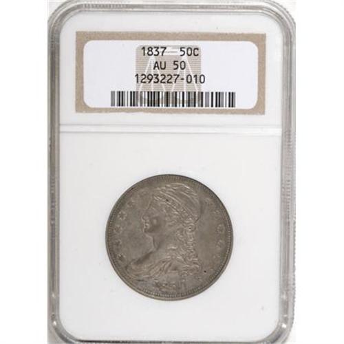 <B>1837 50C AU50 NGC.</B></I> NGC Census: (36/748). PCGS Population (103/639). Mintage: 3,629,820. Numismedia Wsl. Price for NGC/PCGS coin in AU50: $250. (#6176)<BR><BR><B>Coin Engraver:</B> Christian Gobrecht<BR><BR><b>Shipping:</b> Coins & Currency (<a target="_blank" href="http://www.heritageauctions.com/common/shipping.php">view shipping information</a>)
