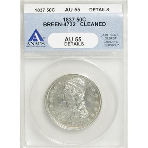 <B>1837 50C --Cleaned--ANACS. AU55 Details. </B></I>Breen-4732.<B> </B></I>NGC Census: (98/620). PCGS Population (150/436). Mintage: 3,629,820. Numismedia Wsl. Price for NGC/PCGS coin in AU55: $321. (#6176)<BR><BR><B>Coin Engraver:</B> Christian Gobrecht<BR><BR><b>Shipping:</b> Coins & Currency (<a target="_blank" href="http://www.heritageauctions.com/common/shipping.php">view shipping information</a>)