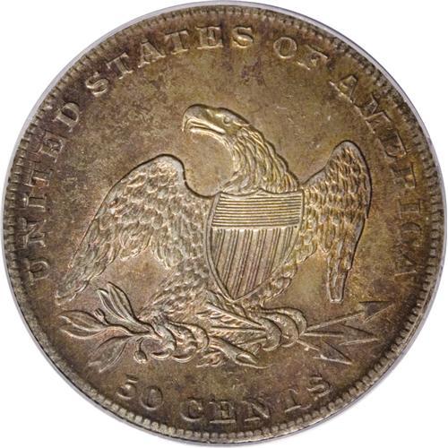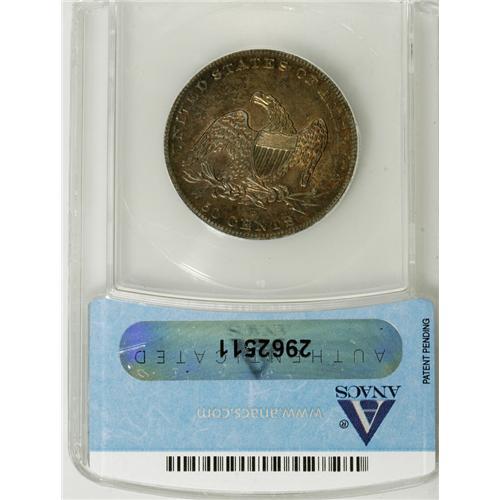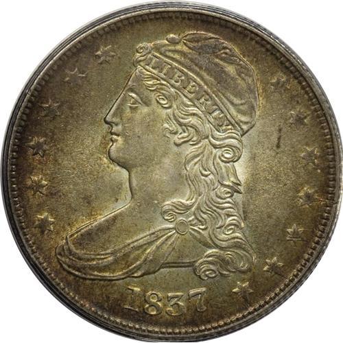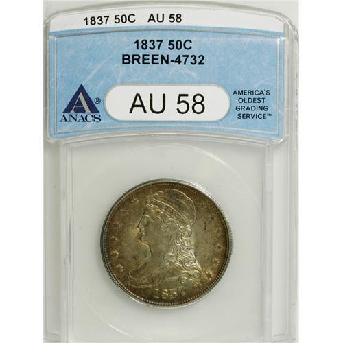 <B>1837 50C AU58 ANACS.</B></I> Breen-4732. Apple-green and orange-gold dominate this satiny and momentarily circulated type coin. Several of the stars are flat, but the major devices are crisply struck.<BR><BR><b>Shipping:</b> Coins & Currency (<a target="_blank" href="http://www.heritageauctions.com/common/shipping.php">view shipping information</a>)