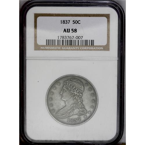 1837 50C AU58 NGC. The surfaces have dark gunmetal and 1837[50C] AU58 NGC.
