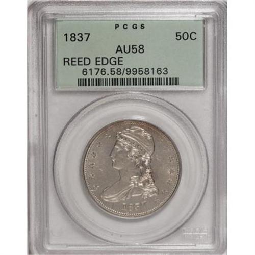 <B>1837 50C AU58 PCGS.</B></I> Lightly die doubled on the olive leaves and nearby legends. Unlisted as such in <I>Cherrypickers'</B></I> or <I>Breen's Encyclopedia</B></I>. This nearly untoned Bust half has good luster and few marks. The strike is sharp aside from the right-side stars. Certified in a green label holder.<BR><BR><B>Coin Engraver:</B> Christian Gobrecht<BR><BR><b>Shipping:</b> Coins & Currency (<a target="_blank" href="http://www.heritageauctions.com/common/shipping.php">view shipping information</a>)