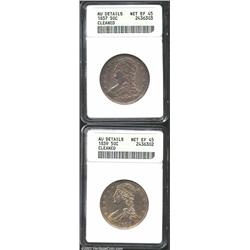 1837 50C--Cleaned--ANACS, AU Details, Net XF45, light gray toning over the bright, cleaned surfaces; and an 1839--Cleaned--ANACS, AU Details, Net XF45, golden toned and well struck. 2 coins Important notice: We expect to be auctioning lots at the rate of 200-250 per hour. Sometimes eBay Premier live bid software cannot keep up with that pace, so we strongly recommend that you place a realistic proxy bid now as insurance to avoid disappointment. Also please note that all Heritage/CAA lots purchased through eBay Premier carry a 20% Buyer's Premium. Please make sure you read the Terms and Conditions.