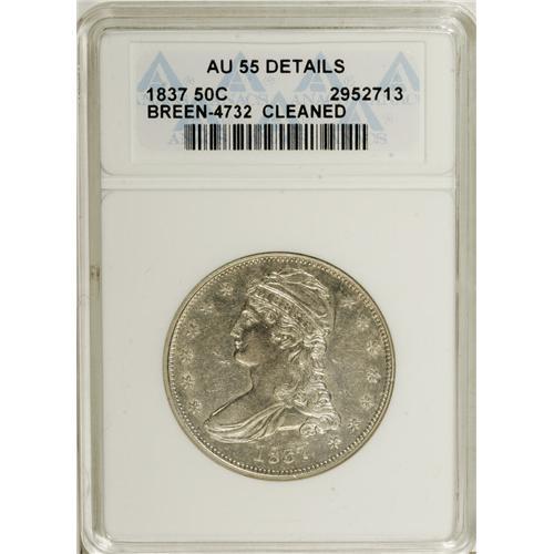 <B>1837 50C --Cleaned--ANACS. AU55 Details.</B></I> Breen-4732. NGC Census: (92/602). PCGS Population (143/431). Mintage: 3,629,820. Numismedia Wsl. Price: $321. (#6176)<BR><BR><b>Shipping:</b> Coins & Currency (<a target="_blank" href="http://www.heritageauctions.com/common/shipping.php">view shipping information</a>)