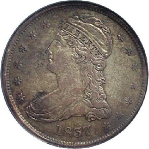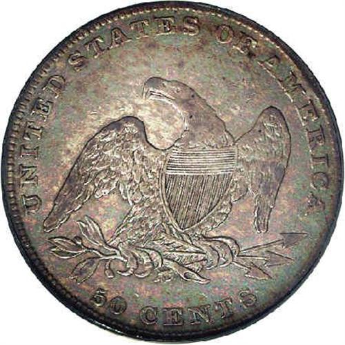 <B>1837<50C>--Environmental Damage--NCS. XF Details.</B></I> JR-3, R.6. The dappled, variegated orange-gold, green, and purple-red toning that adheres to both sides is interrupted by several dark splotches on the obverse, indicative of environmental damage. The striking details are very good, and the degree of wear on the coin seems minimal, for the XF grade level. The scarcity of the 1836 Reeded Edge guarantees the importance of the 1837 among type collectors. Envelope Included.