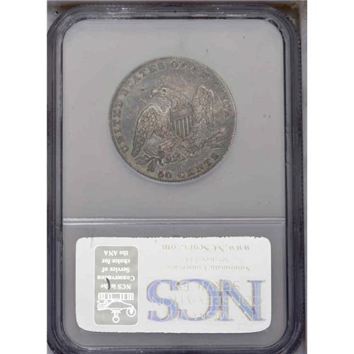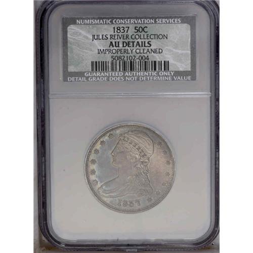 <B>1837<50C>--Improperly Cleaned--NCS. AU Details.</B></I> JR-24d, R.5. A fine crack travels from the bust point to the rim below star 1, and another line seen through E of UNITED. The surfaces are blue-gray and lavender, and are finely hairlined, but devoid of significant abrasions.<BR><I>Ex: Leaman (5/1986).</B></I> Envelope Included.