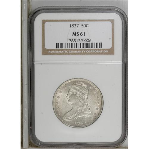 <B>1837 50C MS61 NGC.</B></I> Lustrous surfaces display a silver-gray color, and all of the design elements have benefited from a well executed strike. Light handling marks are visible on Liberty's cheek and neck and in the left obverse field. An important coin for the type collector seeking to acquire a Reeded Edge specimen with "50 CENTS" on the reverse.<BR><BR><b>Shipping:</b> Coins & Currency (<a target="_blank" href="http://www.heritageauctions.com/common/shipping.php">view shipping information</a>)