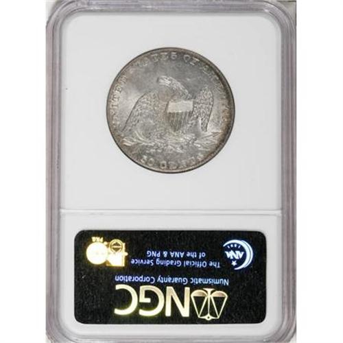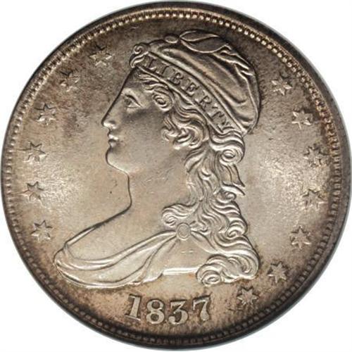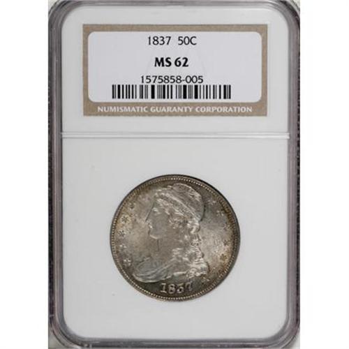 <B>1837 50C MS62 NGC.</B></I> JR-17. The date is evenly spaced on this variety, and there is a spike up from the top of the cap, which if extended downward, would pass over the left side of the R in LIBERTY. Also, Jules Reiver, in his 1988 <I>Variety Identification Manual</B></I>, says the fields are "rough," these having been struck from heavily worn dies. Reiver assigns an R.5 rating to this variety.<BR> Glowing luster issues from both sides of this MS62 example, and the design elements are well brought up, save for minor softness in some of the star centers. Whispers of olive-green, gold, and electric-blue concentrate around the margins. A few minor marks, more so on the reverse, limit the grade. This is a more pleasing example than the assigned grade might suggest.<BR><BR><B>Coin Engraver:</B> Christian Gobrecht<BR><BR><b>Shipping:</b> Coins & Currency (<a target="_blank" href="http://www.heritageauctions.com/common/shipping.php">view shipping information</a>\)
