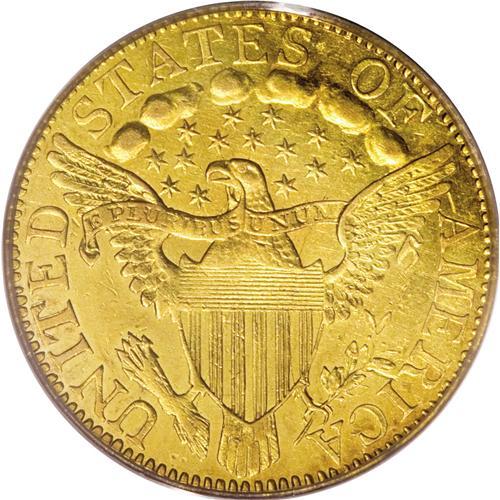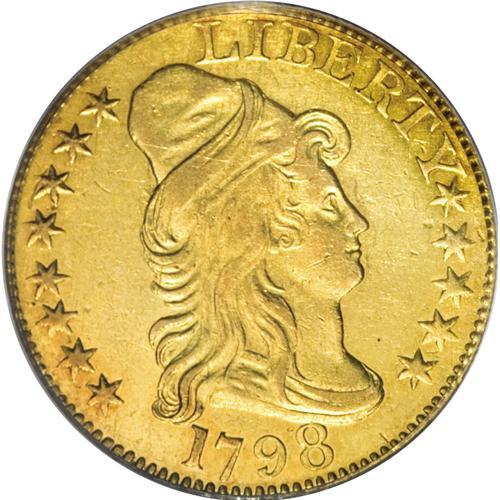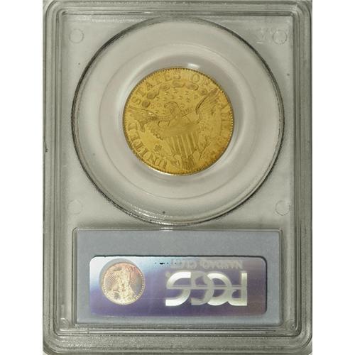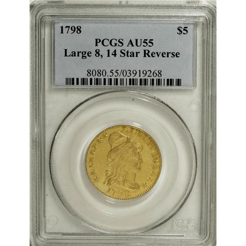 <B>1798 $5 Large Eagle, Large 8, 14 Star Reverse AU55 PCGS.</B></I> Breen-6427, BD-3, R.5. This is a rare die marriage that doubles as an important <I>Guide Book</B></I> variety, placing additional emphasis on its desirability. Both sides have rich green-gold color with hints of orange toning, and the obverse and reverse fields are both reflective and minimally abraded. Both dies show signs of die lapping, and the reverse has several die cracks representing what is probably the terminal die state of the die. As this piece differs from the "terminal die state" described by John Dannreuther, an accounting of the various die cracks is included below. Dannreuther stated a relevant problem about die state records for early gold coins: "It is difficult to describe states or stages if the coins are so rare that there are almost no coins on which to base the descriptions!"<BR> The obverse die appears to be perfect, although evidence suggests that this die may have been lightly lapped. The reverse has multiple cracks or branch cracks, and we cannot be certain the order that they appeared: a curving crack from the border to the final A crosses the branch, shield, scroll, star 6, and bisects the upright of F to the border; a branch up to the left crosses the breast feathers and scroll to stars 13, 7, and 1; a secondary branch extends down through the crossbars to the second vertical stripe, the arrow butts, and the lower border; a tertiary branch extends upward through the eagle's head, stars 10 and 4, cloud 5, and the final S to the border.<BR><I>From The Temecula Collection, Part Two.</B></I><BR><BR><b>Shipping:</b> Coins & Currency (<a target="_blank" href="http://www.heritageauctions.com/common/shipping.php">view shipping information</a>)