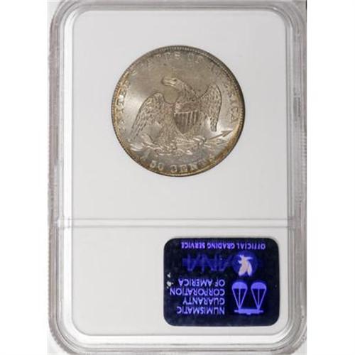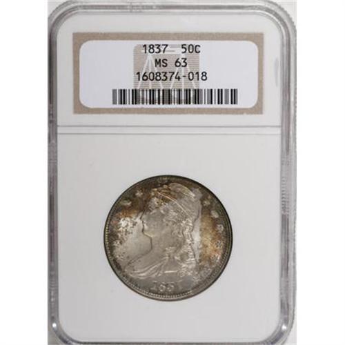 <B>1837 50C MS63 NGC.</B></I> This lustrous Select type coin has prominent golden-brown and ocean-blue obverse toning, although most of the portrait is brilliant. The reverse is pearl-gray with peripheral peach patina. Smooth aside from minor abrasions on the face and neck. The centers are well struck, while the borders are slightly soft.<BR><BR><B>Coin Engraver:</B> Christian Gobrecht<BR><BR><b>Shipping:</b> Coins & Currency (<a target="_blank" href="http://www.heritageauctions.com/common/shipping.php">view shipping information</a>)