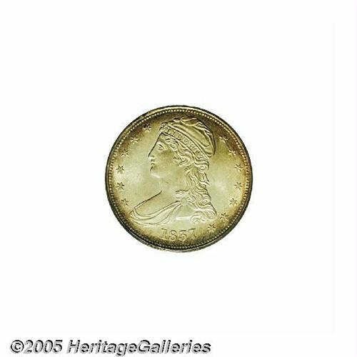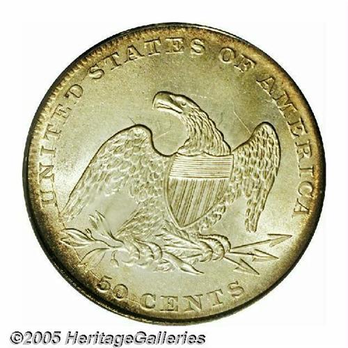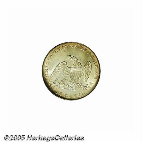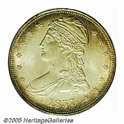 <B>1837<50C> MS63 PCGS.</B></I> A well struck representative of this short-lived type, which was produced on the Mint's new steam press. Pleasing cartwheel luster penetrates the light golden-brown patina. There are no untoward abrasions, and the eye appeal is substantial. Struck from multiply clashed dies, seen on the obverse and reverse. The reverse die is rotated about 40 degrees counterclockwise, and the left reverse border has a lengthy die crack, as made.<BR><I>From The Melrose Bay Collection.</B></I>