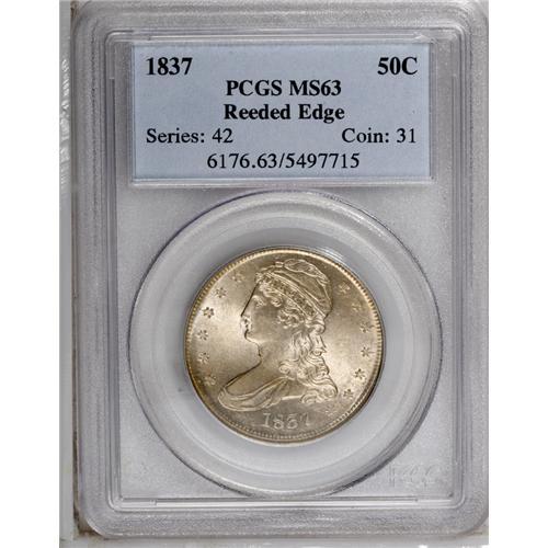 <B>1837 50C MS63 PCGS.</B></I> An important and desirable example for the half dollar type collector, as this is the only high-mintage Reeded Edge issue that sports 50 CENTS on the reverse. The obverse is highly lustrous beneath thin reddish-gold toning, while the reverse deep golden-brown and reddish-brown patina over the eagle. Well-defined with light abrasions on the reverse that account for the grade.<BR><I>From The Stone 1837 Collection.</B></I><BR><BR><b>Shipping:</b> Coin/Currency (<a target="_blank" href="http://www.heritageauctions.com/common/shipping.php">view shipping information</a>)
