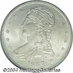 <table><tr><td><TABLE cellSpacing=0 cellPadding=0 width="100%" bgColor=#000000 border=0><TBODY> <TR><TD width="100%"><TABLE cellSpacing=1 cellPadding=3 width="100%" border=0><TBODY><TR><TD width="100%" bgColor=#79735c><FONT face=arial color=#ffffff size=3><B>Description</B> </FONT></TD></TR><TR><TD width="100%" bgColor=#ffffff><FONT face=arial size=2><B>1837 50C MS64 NGC.</B></I> In 1836 the use of the "new" steam coining press necessitated a design change from John Reich's Capped Bust design to a somewhat similar design by Christian Gobrecht. The obsolete lettered edge was replaced by a reeded edge in 1836, however, only 1,200 halves were struck that year with reeded edges. Over 3.6 million 1837 examples were produced (50 CENTS on the reverse), and these have become the most available date for this two year type. Well struck in the centers, some typical weakness is noted on the peripheral devices, and pronounced die cracks circle the borders. The light gray patina does not obscure the underlying luster.<BR><I>From the Fred Miller Collection.</B></I> </FONT></TD></TR></TBODY></TABLE></TD></TR></TBODY></TABLE><BR><A name=PricesRealized></A><TABLE cellSpacing=0 cellPadding=0 width="100%" bgColor=#000000 border=0><TBODY><TR><TD width="100%"><TABLE cellSpacing=1 cellPadding=3 width="100%" border=0><TBODY><TR><TD width="100%" bgColor=#79735c><A name=PR><FONT face=arial color=#ffffff size=3><B>Previous Prices from Heritage Auctions</B> </FONT></A></TD></TR><TR><TD bgColor=#f6f6ed><TABLE cellSpacing=0 cellPadding=0 width="100%" border=1><TBODY><TR><TD align=middle width="33%"><B>Date</B></TD><TD align=middle width="33%"><B>Service</B></TD><TD align=middle width="33%"><B>Price</B></TD></TR><TR bgColor=whitesmoke><TD width="33%"><B>07/29/2003</B></TD><TD width="33%">NGC</TD><TD width="33%">$3,105.00</TD></TR><TR bgColor=whitesmoke><TD width="33%"><B>01/11/2003</B></TD><TD width="33%">NGC</TD><TD width="33%">$2,875.00</TD></TR><TR bgColor=whitesmoke><TD width="33%"><B>08/08/2001</B></TD><TD width="33%">PCGS</TD><TD width="33%">$4,485.00</TD></TR><TR bgColor=whitesmoke><TD width="33%"><B>08/05/2000</B></TD><TD width="33%">NGC</TD><TD width="33%">$2,415.00</TD></TR><TR bgColor=whitesmoke><TD width="33%"><B>08/13/1999</B></TD><TD width="33%">PCGS</TD><TD width="33%">$3,220.00</TD></TR><TR bgColor=whitesmoke><TD width="33%"><B>08/02/1997</B></TD><TD width="33%">PCGS</TD><TD width="33%">$3,450.00</TD></TR><TR bgColor=whitesmoke><TD width="33%"><B>08/02/1997</B></TD><TD width="33%">NGC</TD><TD width="33%">$2,070.00</TD></TR><TR bgColor=whitesmoke><TD width="33%"><B>08/17/1996</B></TD><TD width="33%">PCGS</TD><TD width="33%">$4,950.00</TD></TR><TR bgColor=whitesmoke><TD width="33%"><B>06/04/1995</B></TD><TD width="33%">PCGS</TD><TD width="33%">$3,080.00</TD></TR><TR bgColor=whitesmoke><TD width="33%"><B>06/04/1993</B></TD><TD width="33%">PCGS</TD><TD width="33%">$3,630.00</TD></TR><TR bgColor=whitesmoke><TD width="33%"><B>03/21/2002</B></TD><TD width="33%">PCGS</TD><TD width="33%">$2,990.00</TD></TR><TR bgColor=whitesmoke><TD width="33%"><B>01/01/1999</B></TD><TD width="33%">PCGS</TD><TD width="33%">$6,210.00</TD></TR><TR bgColor=whitesmoke><TD width="33%"><B>01/01/1999</B></TD><TD width="33%">PCGS</TD><TD width="33%">$6,613.00</TD></TR></TBODY></TABLE></TD></TR><TR><TD bgColor=#ffffff><FONT face=arial size=1 ?>PLEASE NOTE: All prices realized reflect the final hammer price PLUS the buyer's premium in auctions that charge a buyer's premium. Each item has a notation at the top of the listing indicating whether that lot included a buyer's premium. Example: A item that sells with a final hammer price of $100 and a 20% buyer's premium will display with a price realized of $120. All information listed is intended to be as accurate as possible, but errors are possible. Please use this guide carefully and inform us of any inaccuracies. </FONT></TD></TR></TBODY></TABLE></TD></TR></TBODY></TABLE><BR><TABLE cellSpacing=0 cellPadding=0 width="100%" bgColor=#000000 border=0><TBODY><TR><TD width="100%"><TABLE cellSpacing=1 cellPadding=3 width="100%" border=0><TBODY><TR><TD width="100%" bgColor=#79735c colSpan=6><FONT face=arial color=#ffffff size=3><B>Price Guide*</B> </FONT></TD></TR><TR bgColor=#f6f6ed><TD align=middle><B>Grade</B> </TD><TD align=middle><B>Coin World<BR>(Trends)</B> </TD><TD align=middle><B>Numismedia<BR>Retail</B> </TD><TD align=middle><B>Numismedia<BR>Wholesale</B> </TD><TD align=middle><B>Coin<BR>Universe</B> </TD><TD align=middle><B>Heritage<BR>Value Index</B> </TD></TR><TR bgColor=#ffffff><TD align=middle>63</TD><TD align=right>$1,650.00</TD><TD align=right>---</TD><TD align=right>$1,550.00</TD><TD align=right>$2,150.00</TD><TD align=right>$1,461.63</TD></TR><TR style="FONT-WEIGHT: bold" bgColor=#cccfdd><TD align=middle>64</TD><TD align=right>$4,000.00</TD><TD align=right>---</TD><TD align=right>$3,675.00</TD><TD align=right>$5,250.00</TD><TD align=right>$3,215.00</TD></TR><TR bgColor=#ffffff><TD align=middle>65</TD><TD align=right>---</TD><TD align=right>---</TD><TD align=right>$8,650.00</TD><TD align=right>$16,000.00</TD><TD align=right>$8,578.33</TD></TR><TR bgColor=#ffffff><TD colSpan=6><FONT size=1>*All information listed is intended to be as accurate as possible, but errors are possible. No item may be returned or refused based on this information which is provided as a service to our customers. You should contact each pricing source directly to determine the accuracy of this information. </FONT></TD></TR></TBODY></TABLE></TD></TR></TBODY></TABLE><BR><TABLE cellSpacing=0 cellPadding=0 width="100%" bgColor=#000000 border=0><TBODY><TR><TD width="100%"><TABLE cellSpacing=1 cellPadding=3 width="100%" border=0><TBODY><TR><TD width="100%" bgColor=#79735c><FONT face=arial color=#ffffff size=3><B>Population Guide</B> </FONT></TD></TR><TR bgColor=#ffffff><TD align=middle><!-- Begin Output of Population Grid--><TABLE cellSpacing=0 cellPadding=0 width="100%" border=0><TBODY><TR><TD vAlign=center><T