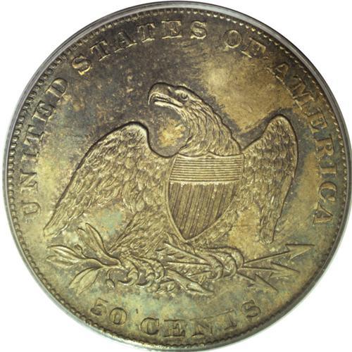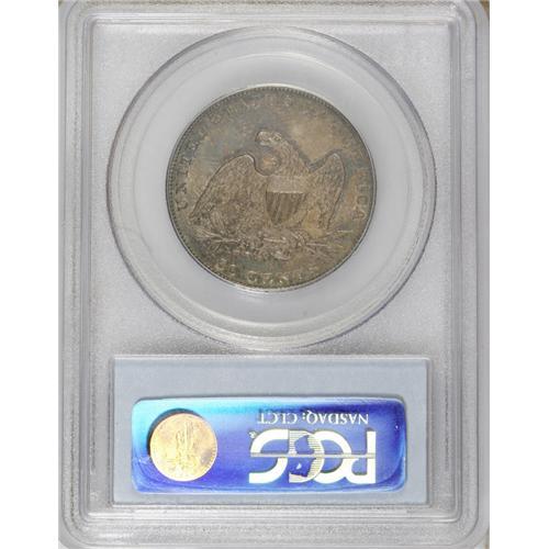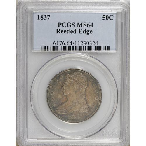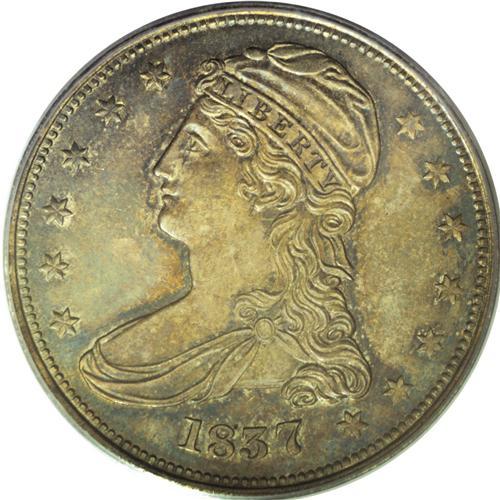 <B>1837 50C MS64 PCGS.</B></I> JR-6, Die State a. Attributed by recutting on the 7 in the date, a crack from the rim through stars 4, 5, 6, the curl and cap to stars 8 and 9, and a crack from the bottom of the N in CENTS that travels left through 50 CE, the leaves, wing tip, the bottom of UNITED ST to the middle of A, and another crack from the top of the first T in STATES through ATES, the bottom of OF AMER, up through IC to the top of A, through the arrowheads to the top of E in CENTS.<BR> Variegated medium intensity cobalt-blue, lavender, and gray-tan patination bathes each side of this near-Gem half dollar. The design elements display excellent delineation, except for minor softness in some of the star centers, and soft luster rests on generally well preserved surfaces. A couple of minute marks in the upper right reverse quadrant are mentioned for complete accuracy, and may help to identify the piece.<BR><BR><b>Shipping:</b> Coins & Currency (<a target="_blank" href="http://www.heritageauctions.com/common/shipping.php">view shipping information</a>)