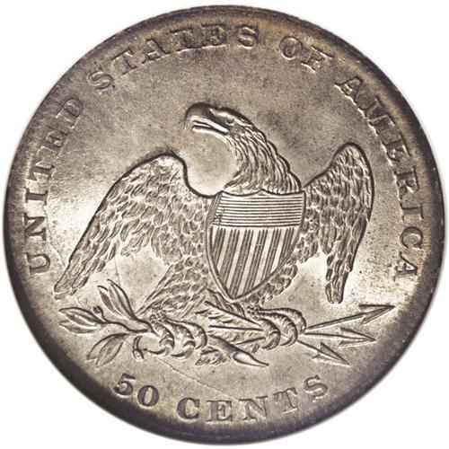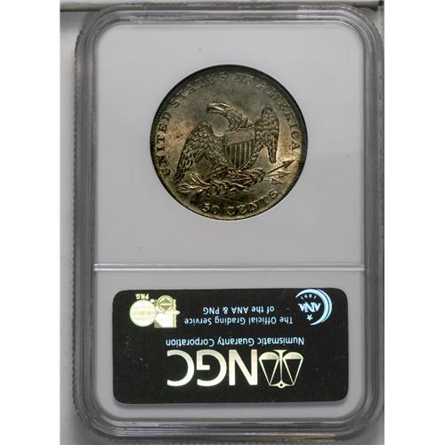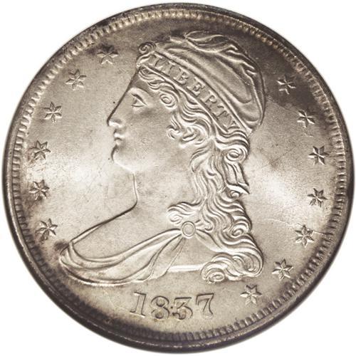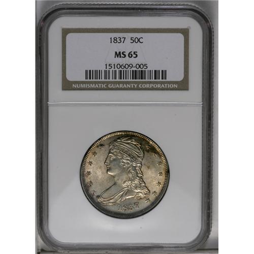 <B>1837<50C> MS65 NGC.</B></I> Reeded edge Bust half dollars are a neglected series. Little attention is paid to the 1837, except by silver type collectors who need the issue since its alternative is the costly, low mintage 1836. Jules Reiver assembled a significant collection of the series by die variety and major die state, and perhaps he is the only numismatist to do so. This may change in the future, since it is a short, attractive, and affordable series, if the very rare 1838-O is omitted. This lustrous Gem has pinpoint-sharp major devices, and even the borders are nicely brought up. The golden-brown toning is light across the obverse center and somewhat deeper on the reverse and the obverse border. Census: 37 in 65, 14 finer (7/06).