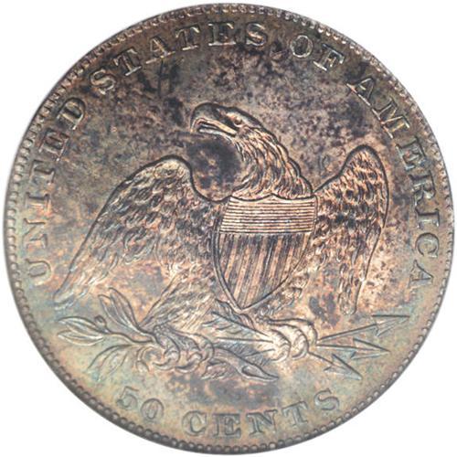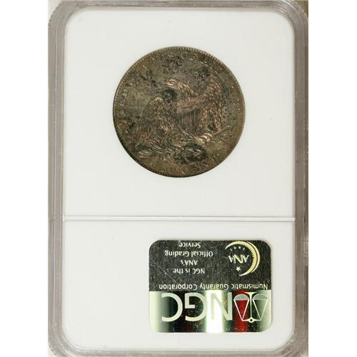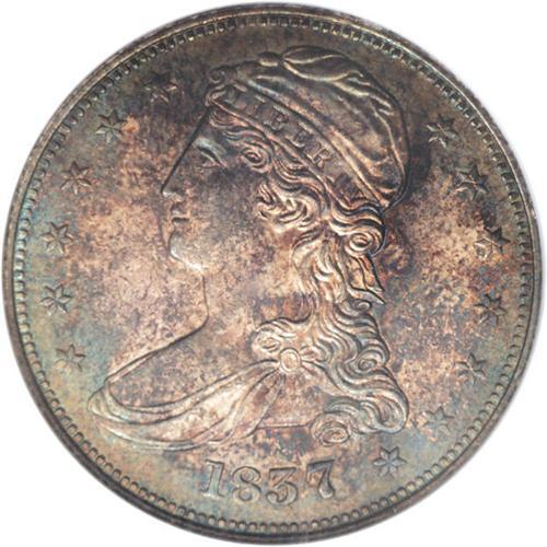 <B>1837 50C MS65 NGC.</B></I> JR-24a. On the obverse, a heavy line shows from the rim through the right part of star 7, and there is a spike to the right from the curl over the left side of the L of LIBERTY. The reverse shows a fine line from the top of the U in UNITED slightly down to the right through N. The 1837 is one of only two issues of Christian Gobrecht's Reeded Edge, 50 CENTS Reverse Half Dollar. The scarcity of the low mintage (1,200 pieces) 1836 explains the desirability of the 1837 among high quality type collectors. In 1836 the use of the "new" steam coining press necessitated a design change from John Reich's Capped Bust design to a somewhat similar design by Christian Gobrecht. The obsolete lettered edge was replaced by a reeded edge in 1836, however, as previously stated, only a limited number were struck. General production began the next year with over 3.6 million 1837 examples being coined (50 CENTS on the reverse), and these have become the most available date for this two year type. Few survivors possess the appeal of this richly toned representative. Deep copper-rose and charcoal-gray toning overlays each side with sea-green patination interspersed. Boldly struck in all areas, an exceptionally smooth example with only a couple of almost invisible marks on Liberty's cheek. Census: 36 in 65, 12 finer (4/07).<BR><BR><b>Shipping:</b> Coins & Currency (<a target="_blank" href="http://www.heritageauctions.com/common/shipping.php">view shipping information</a>)