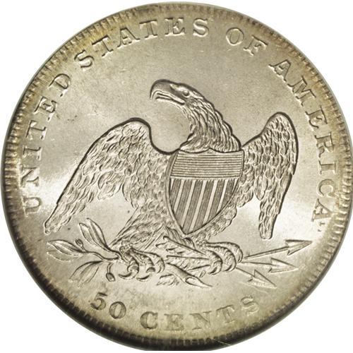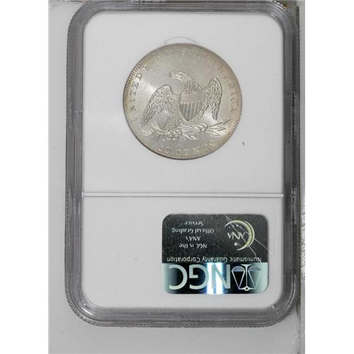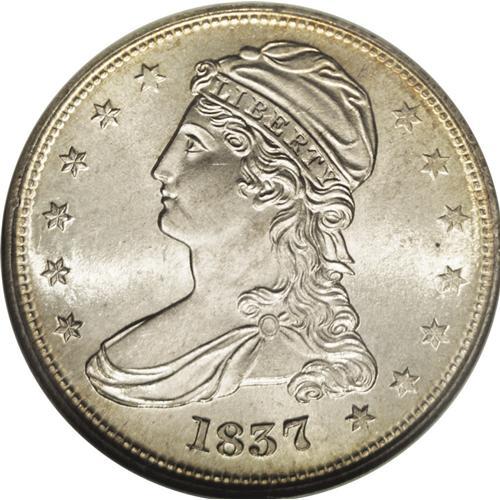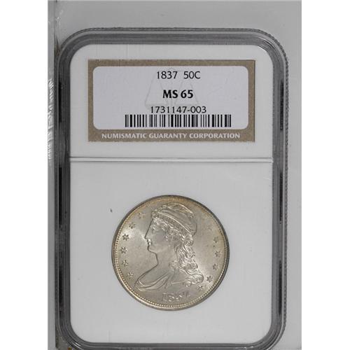 <B>1837<50C> MS65 NGC.</B></I> Vibrant cartwheel luster bathes this gently toned high grade type coin. Honey patina is apparent at the borders, while the well struck centers are light cream-gray. Beautifully smooth, since the only visible imperfection is a wispy, curved graze on the left obverse field. A few of the upper stars are soft, but the strike is above average for the briefly-issued type. Except for the ultra low mintage 1836, the FIFTY CENTS type was only struck in 1837. The ever-tinkering Gobrecht modified the denomination to HALF DOL. in 1838, then replaced the Capped Bust design with the Seated Liberty motif in 1839. Census: 37 in 65, 16 finer (7/06).