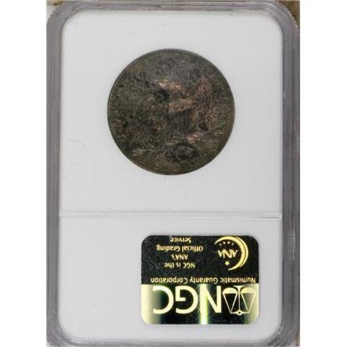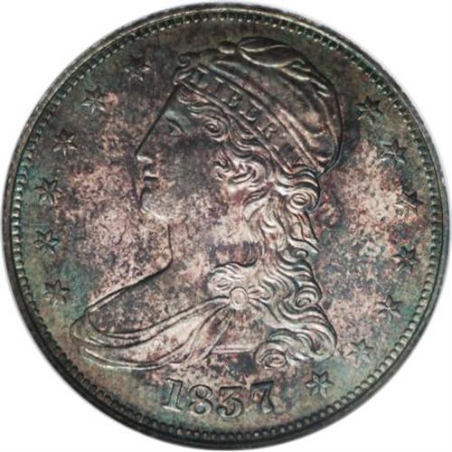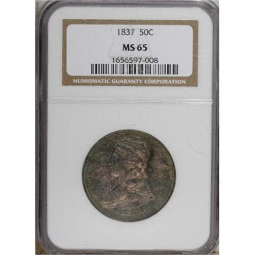 <B>1837 50C MS65 NGC.</B></I> JR-24a. On the obverse, a heavy line extends from the rim through the right part of star 7, and there is a spike to the right from the curl over the left side of the L of LIBERTY. The reverse shows a fine line from the top of the U in UNITED slightly down to the right through N. The 1837 is one of only two issues of Christian Gobrecht's Reeded Edge, 50 CENTS Reverse half dollar. The scarcity of the low mintage (1,200 pieces) 1836 explains the desirability of the 1837 among high quality type collectors.<BR> In 1836, the use of the "new" steam coining press necessitated a design change from John Reich's Capped Bust design to a somewhat similar design by Christian Gobrecht. The obsolete lettered edge was replaced by a reeded edge in 1836; however, as previously stated, only a limited number were struck. General production began the next year with more than 3.6 million 1837 examples coined (50 CENTS on the reverse), and these have become the most available date for this two-year type. Few survivors possess the appeal of this richly toned representative. Deep copper-rose and charcoal-gray toning overlays each side with sea-green patination interspersed. Boldly struck in all areas, this is an exceptionally smooth example with only a couple of almost invisible marks on Liberty's cheek. Census: 36 in 65, 12 finer (6/07).<BR><BR><b>Shipping:</b> Coins & Currency (<a target="_blank" href="http://www.heritageauctions.com/common/shipping.php">view shipping information</a>)