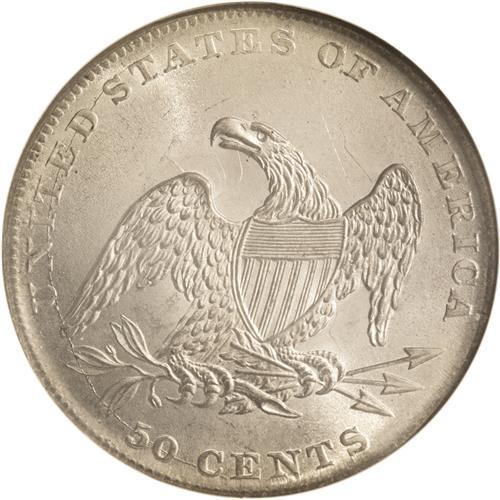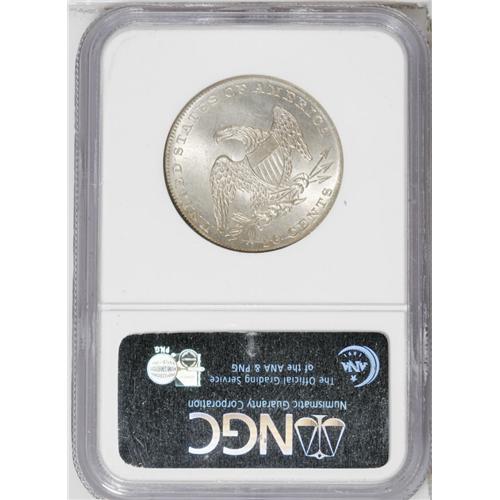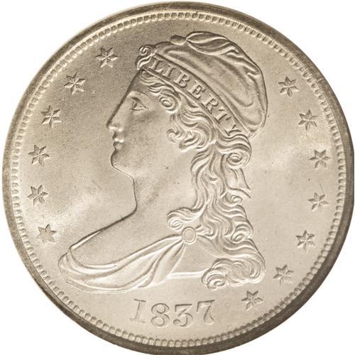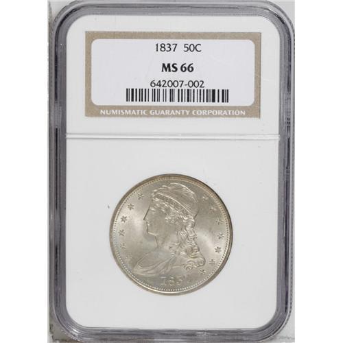 <B>1837<50C> MS66 NGC.</B></I> The mintage of the initial-year 1836 issue in the Capped Bust, reeded edge half dollars was a paltry 1,200 pieces. As a result, numismatists turn to this second-year issue for type purposes, with a much more generous mintage of more than 3.6 million examples. The present coin has brilliant cartwheel luster, with just a touch of silver-gold patina on each side. A phenomenally bold strike greets the viewer of this delectable Premium Gem specimen. Every star save for one shows its full central details, each strand of hair is sculpted, and the eagle's claws and feathers are all crisp and full. A wispy obverse die crack runs from the eyebrow through LI in LIBERTY and up to the top fold of the cap. On the reverse, a much larger die crack runs from 50C clockwise near the rim through UNITED STA. Light clash marks also show on the reverse, which is rotated about 45 degrees counterclockwise. This piece, one of the most boldly struck this cataloger has ever seen, approaches the top end of certified examples, with only five pieces at NGC and PCGS finer (7/06).