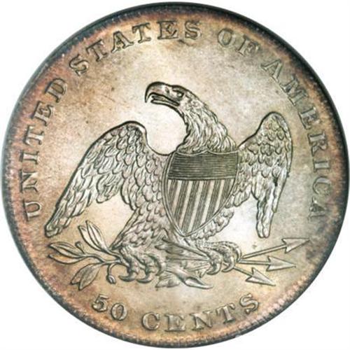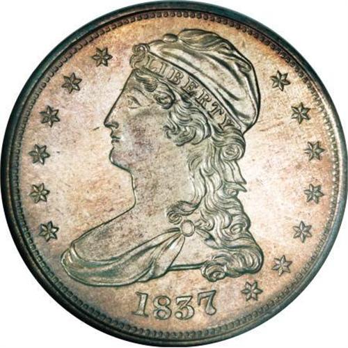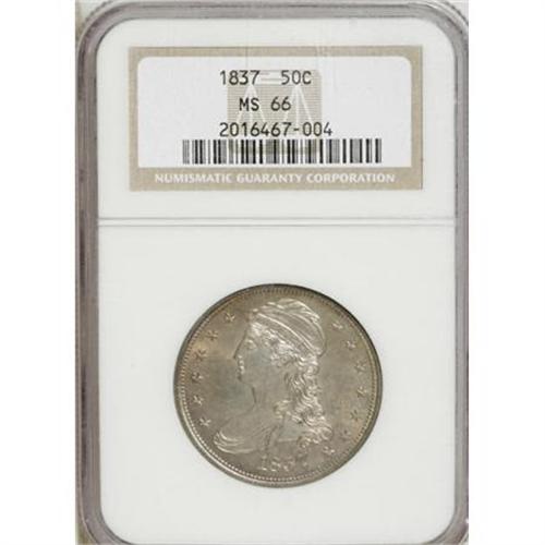 <B>1837 50C MS66 NGC.</B></I> The change from the 50 CENTS reverse of 1837 to the HALF DOL. reverse of 1838 created a distinct two-year type for the first steam power halves, and while the 1836 has a minuscule mintage, the 1837 is much more available and the issue of choice for type collectors. Even though a number of examples were saved and Mint State pieces appear on the market with some regularity, the presence of a Premium Gem such as this is a far less frequent event. Sharply struck with powerful luster, this captivating, slightly satiny coin displays warm reddish-tinged orange patina over most of the fields. Small untoned sections further enliven the appearance of the piece. An immensely desirable coin and an exquisitely preserved, tangible memento of an exciting chapter in Mint history. Census: 9 in 66, 3 finer (11/07).<BR><I>From The Madison Collection.</B></I><BR><BR><B>Coin Engraver:</B> Christian Gobrecht<BR><BR><b>Shipping:</b> Coins & Currency (<a target="_blank" href="http://www.heritageauctions.com/common/shipping.php">view shipping information</a>)