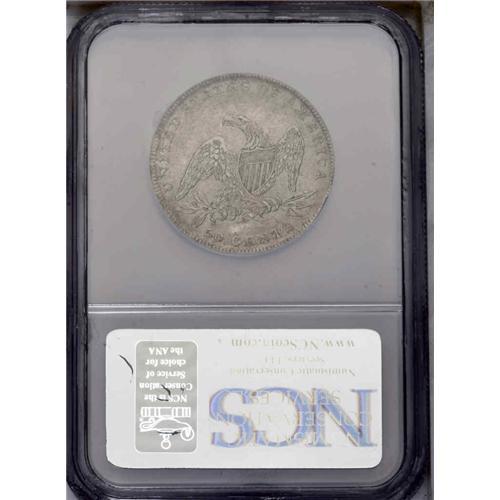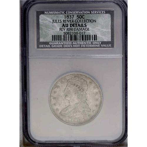 <B>1837<50C>--Reverse Rim Damage--NCS. AU Details.</B></I> JR-14, R.7. This later obverse die state of the JR-13 variety no longer contains the lump below the O of OF or the fine crack through 50. The surfaces display pleasing light gray patination and hints of luster in some of the protected areas. Relatively sharp definition is apparent on the design features, though a couple of the star centers are soft. The NCS disclaimer alludes to a moderate reverse rim bruise at 4 o'clock. While noticeable, this slight impairment does not detract terribly from the otherwise appealing aspects of this coin.<BR><I>Ex: Stack's (4/1986).</B></I> Envelope Included.