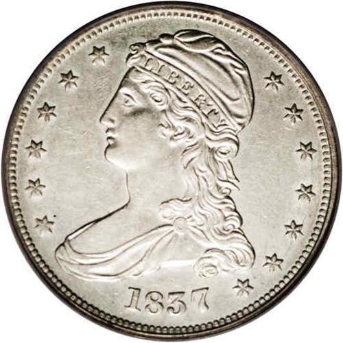 <B>1837<50C>--Reverse Rim filed--NCS. Unc Details.</B></I> JR-21, R.4. This variety shows a light rim crack from the rim near star 8 through stars 9-12 to the rim, and another from the eagle's right (left facing) wing tip to the rim at 8 o'clock. Silvery surfaces display just a few unobtrusive contract marks on the obverse. Light file marks are noted on the lower reverse rim.<BR><I>Ex: Heritage (2/1986), lot 1060.</B></I> Envelope Included.